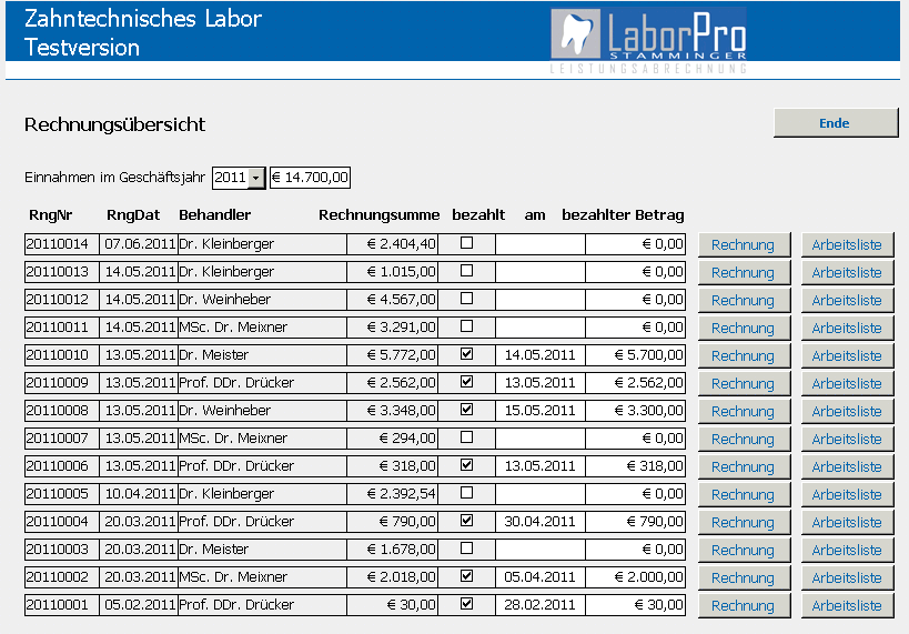 Rechnungsübersicht: bereits erstellte Rechnungen können hier eingesehen und bei Bedarf neu gedruckt werden |