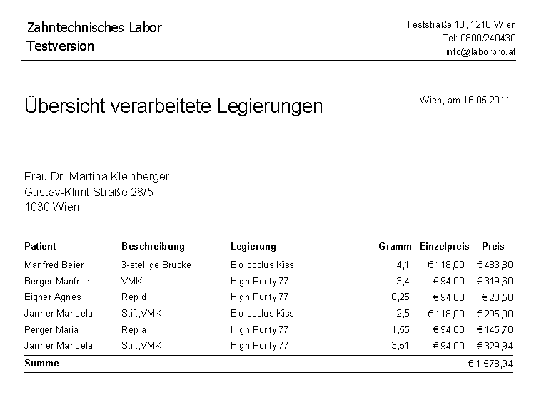 verarbeitete Legierungen - können für einzelne Behandler oder als Gesamtliste angezeigt